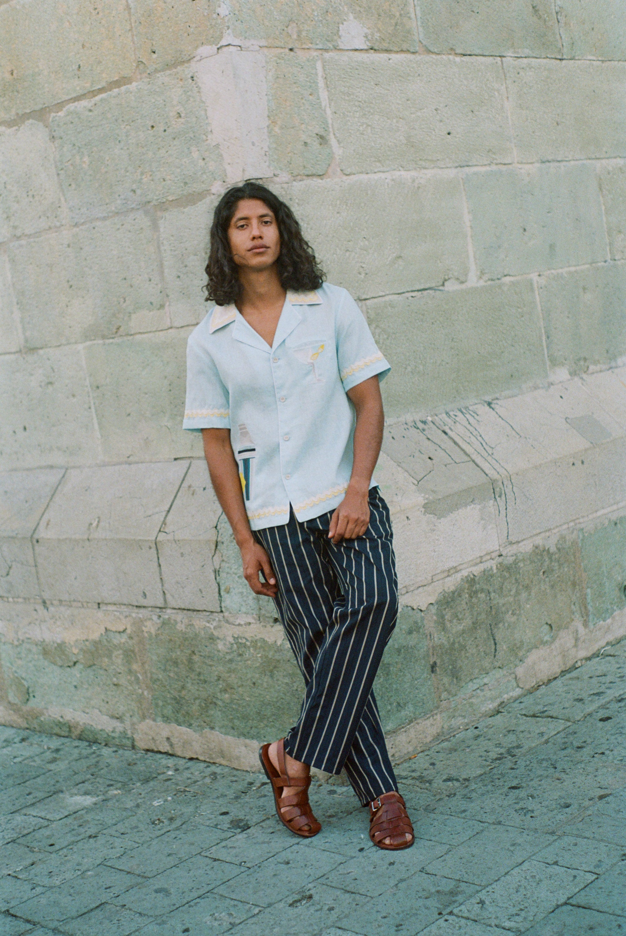 First, the 'Alexis Zambrano x Tombolo' Martini Cabana. This is a linen shirt inspired by Zambrano's 'A Night at Bemelmans' painting-- his martini and shaker in particular. The shirt's rick-rack embroidery is a nod to the lemon twist!