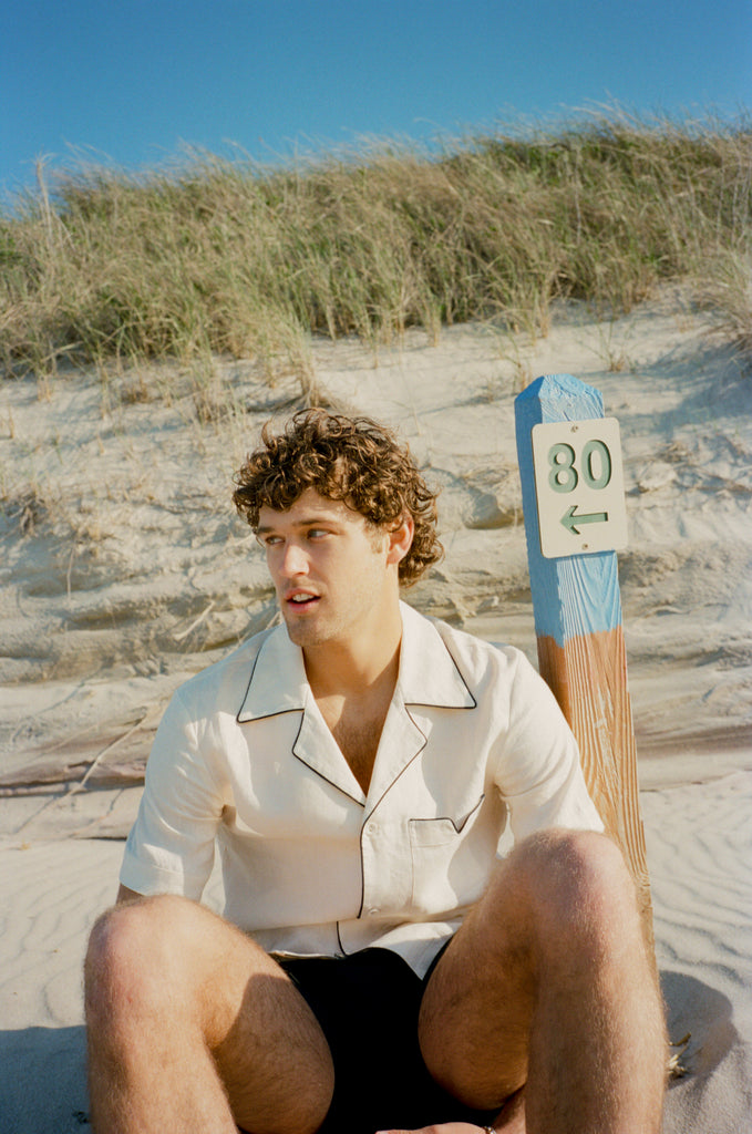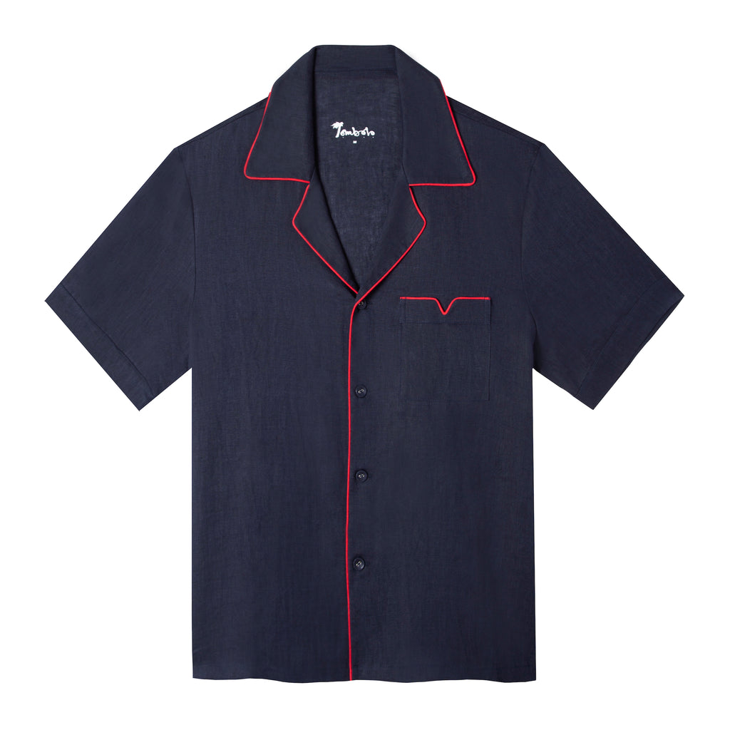 This is a solid navy shirt with crimson piping. Photos of our parchment-colored solid shirt are included as a fabric/fit reference.