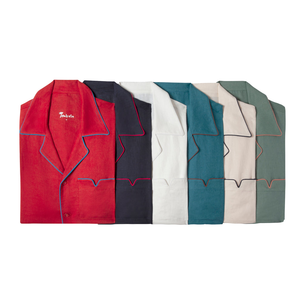 100% linen. Linen requires less water to produce than cotton, and it's strong, breathable and absorbent. It's no wonder it's the oldest known fiber. We chose a nice thick weight because it doesn't wrinkle as much and travels well, while still being breezy. Machine wash cold, tumble dry low.