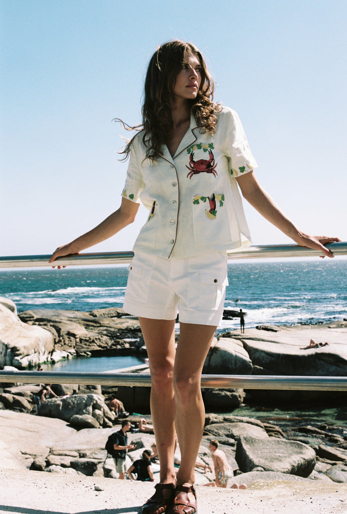 Lyla is 5' 9 1/2" with bust/waist/hips of 34''/25''/36'' and wears a size 6 US dress. She is wearing our Stowaway Shorts in size 28. She is pictured wearing our 'Just a Pinch' Cabana ~ Crop Cut in size M, available here.
