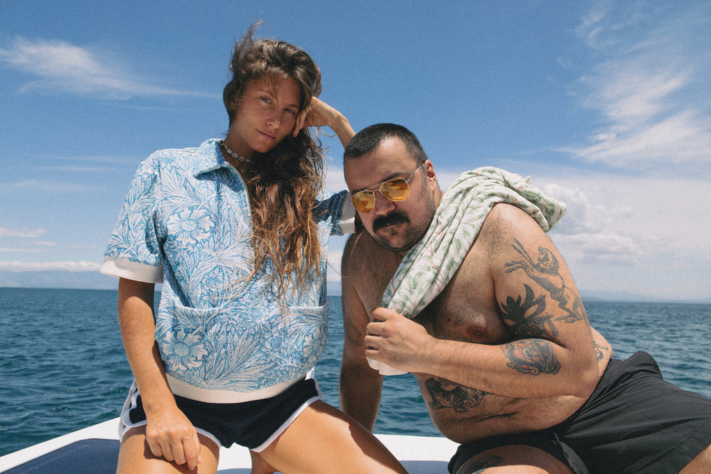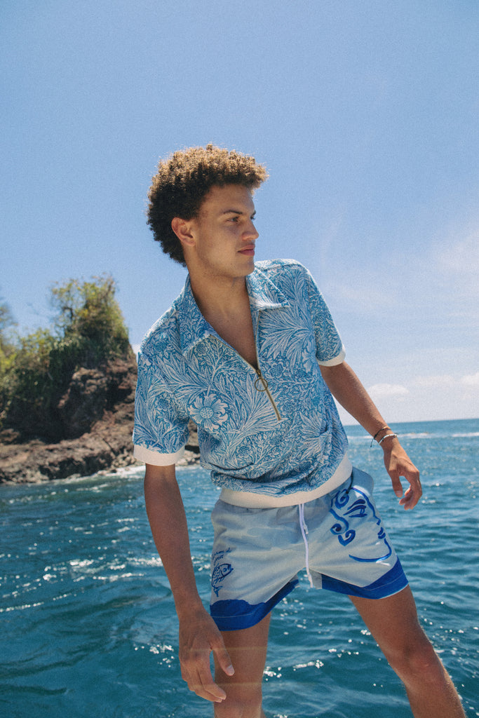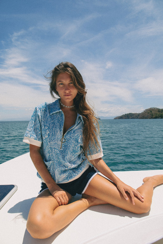 This rendition of the classic cabana shirt is digitally printed with "Marigold", a design released by William Morris in 1875. Antique brass half zip with lower patch pockets. Made of lightweight, organic terry cloth, this shirt doubles as a towel on a beach day.