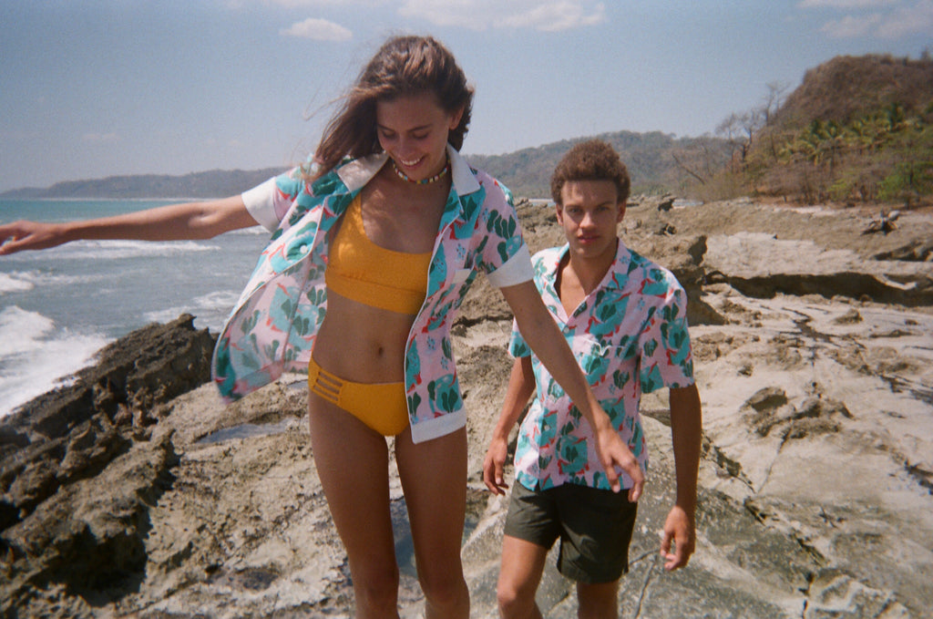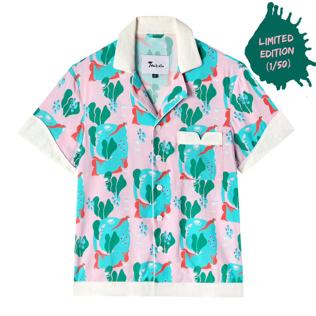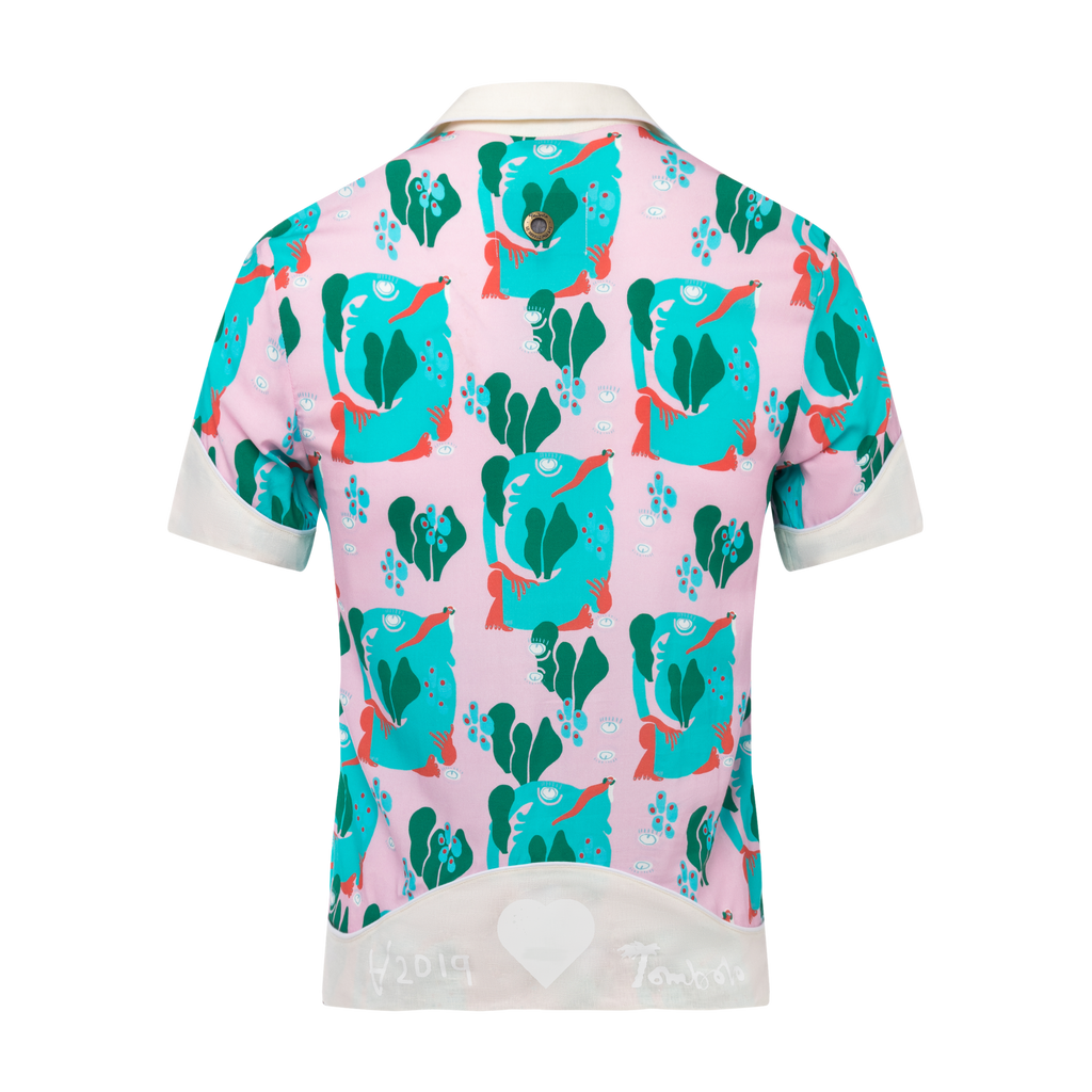 The limited edition shirt has the classic Tombolo camp-collar pattern and special white fisheye buttons. It features ivory linen contrasts for the collar, cuffs, pocket, and sweeps. It has screenprinted signatures for Amber Vittoria and Tombolo on the back. No more than 50 will ever be sold.