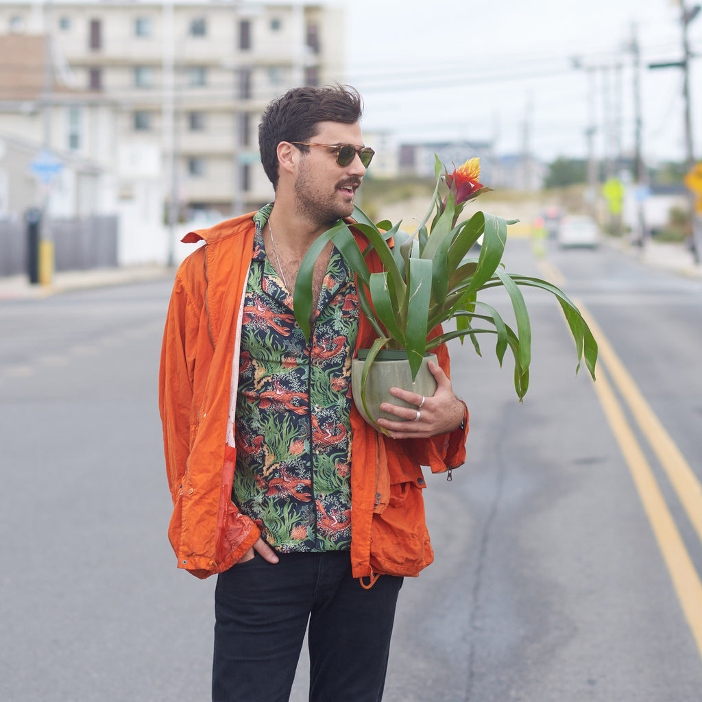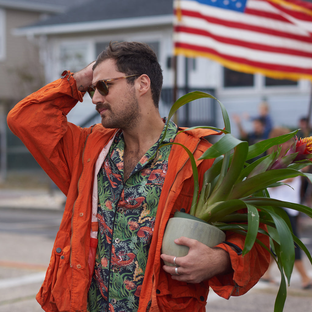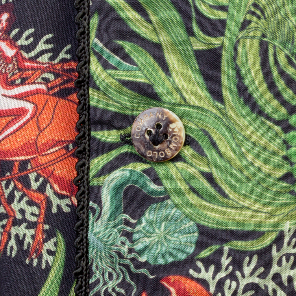 The shirt has engraved Agoya shell buttons and horizontal buttonholes, which are a hallmark of traditional Hawaiian shirts. We've used a smartphone-friendly slit pocket that minimizes interruption to the print. This shirt has long sleeves, black twisted piping, and a ventilated grommet on the upper back that helps 'Let the Breeze In.'