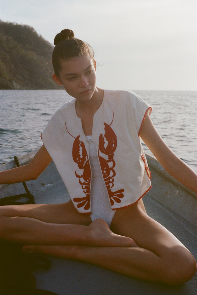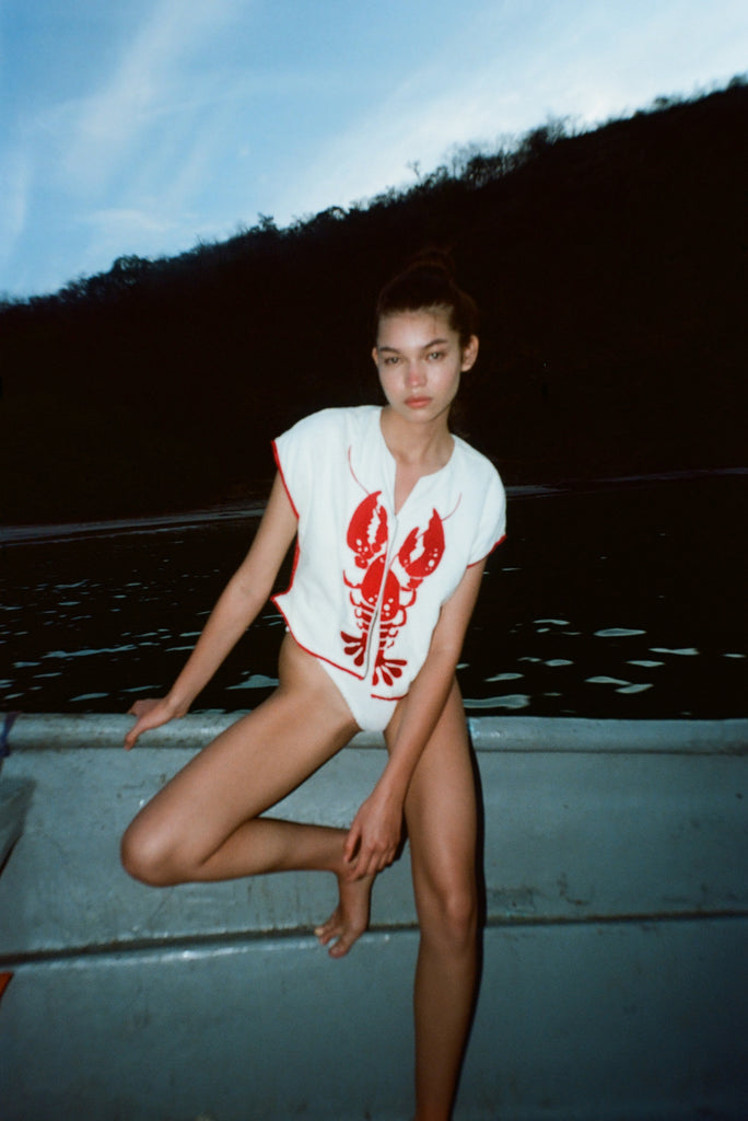 The large lobster halved by the front opening is chain-stitched ever-so-neatly.