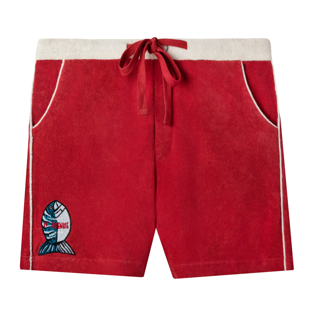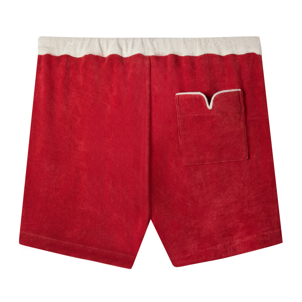The cabana set was a common sight on beaches across the coasts of the USA and Europe in the 1950's and 60's. Our 'Le Sirenuse' Pop-On Shorts are a reimagining in organic cotton terry cloth dyed to match Le Sirenuse's signature 'Pompeiian Red'.