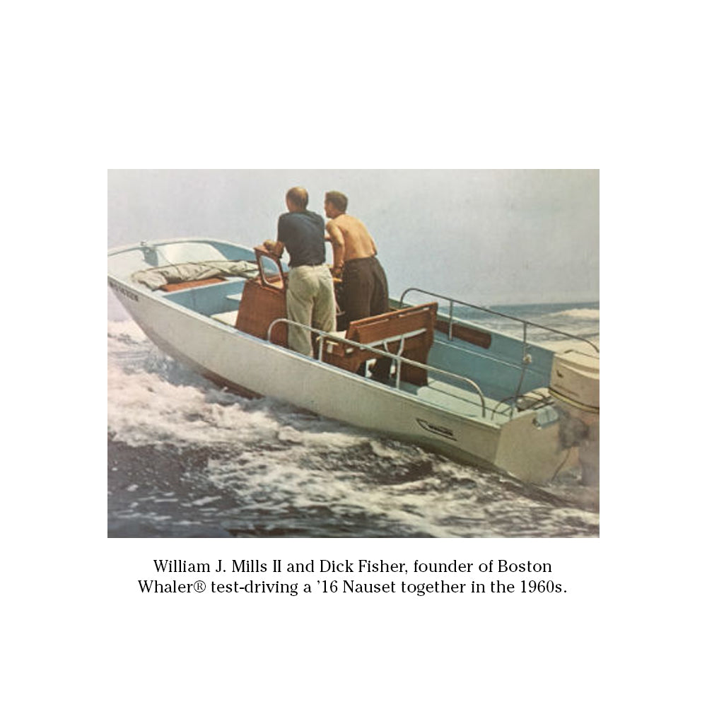 With the continued rise in motorized boats, William J. Mills II (Bill) moved the company into custom marine canvas work. The high-quality of Bill's work led to the start of Wm. J. Mills & Co.'s partnership with Boston Whaler® and a friendship between Bill and Dick Fisher, the founder of Boston Whaler® boats (see photo).