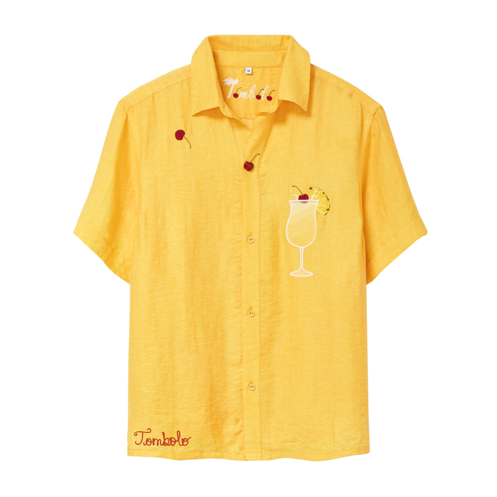 This piña colada shirt is our new relaxed fit: still a unisex camp collar style, but in a more generous, breezy cut than our standard fit. It is roomier through the body, with longer sleeves, and slightly dropped shoulders.