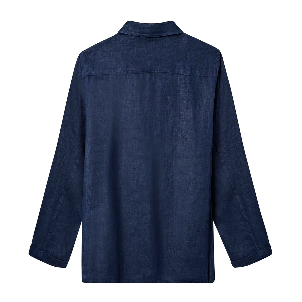 100% linen. Linen requires less water to produce than cotton, and it's strong, breathable and absorbent. It's no wonder it's the oldest known fiber. We chose a nice thick weight because it doesn't wrinkle as much and travels well (foldable into normal luggage), while still being breezy. Please dry-clean this garment.