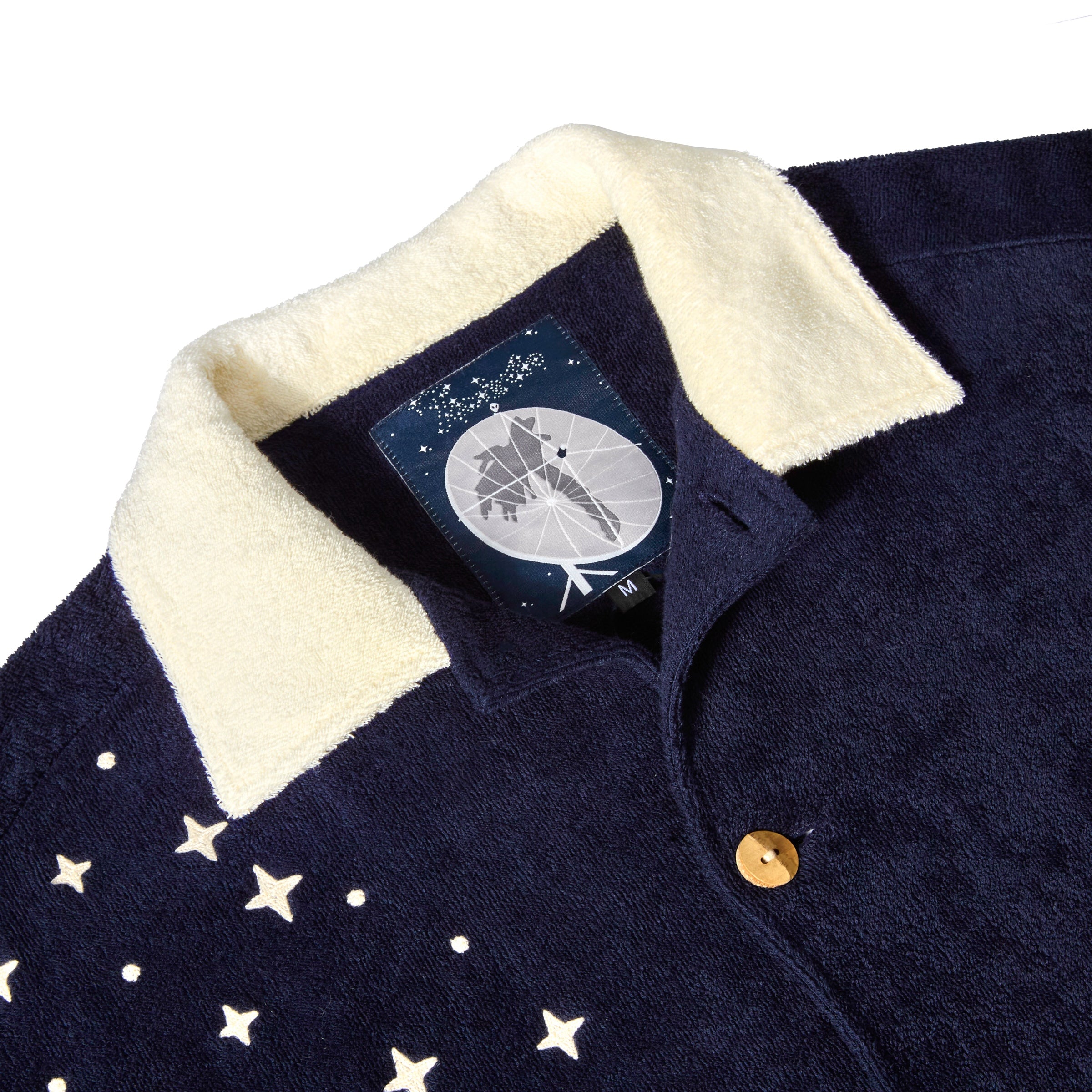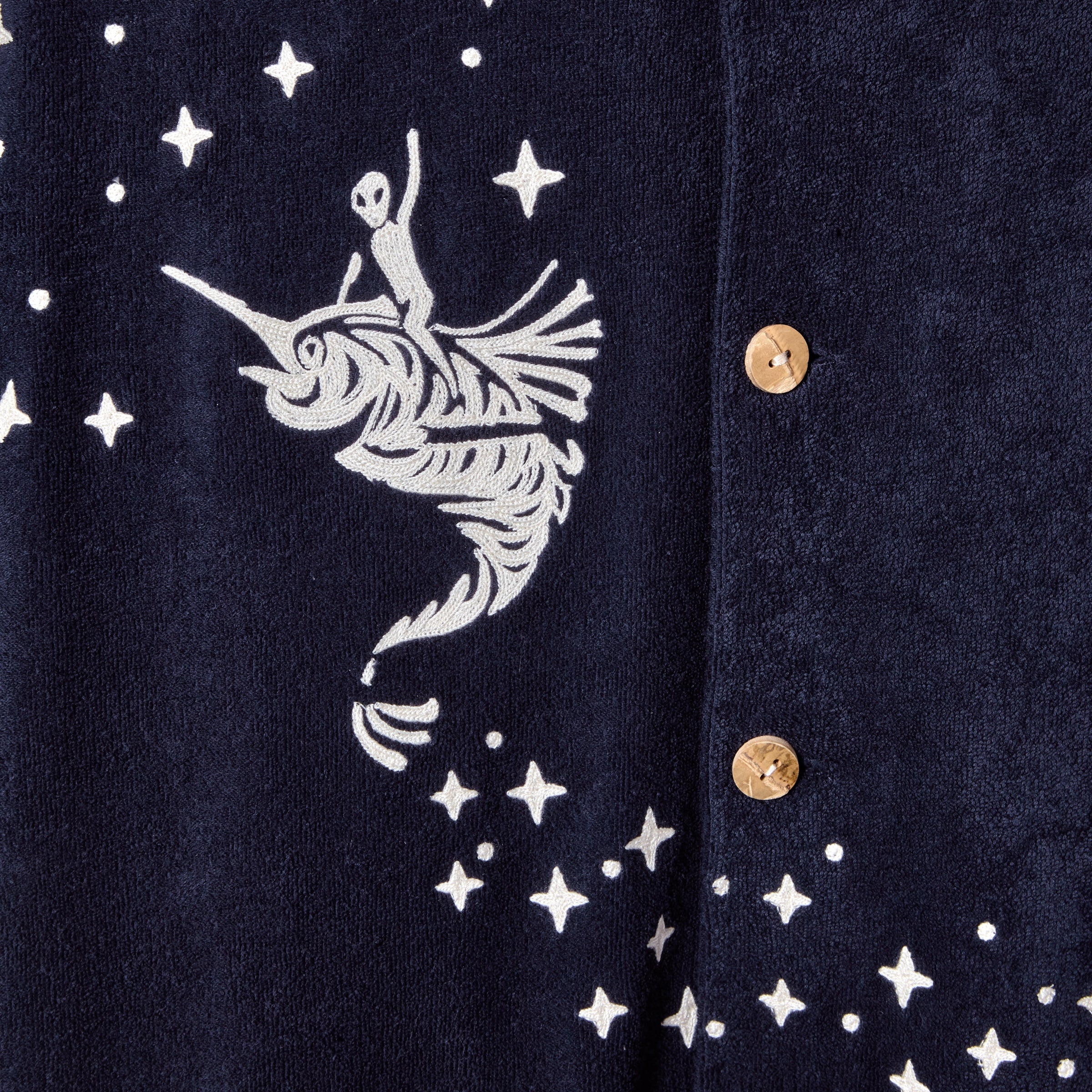 Chain-stitched stardust arching across body, and along cuffs and bottom sweep.