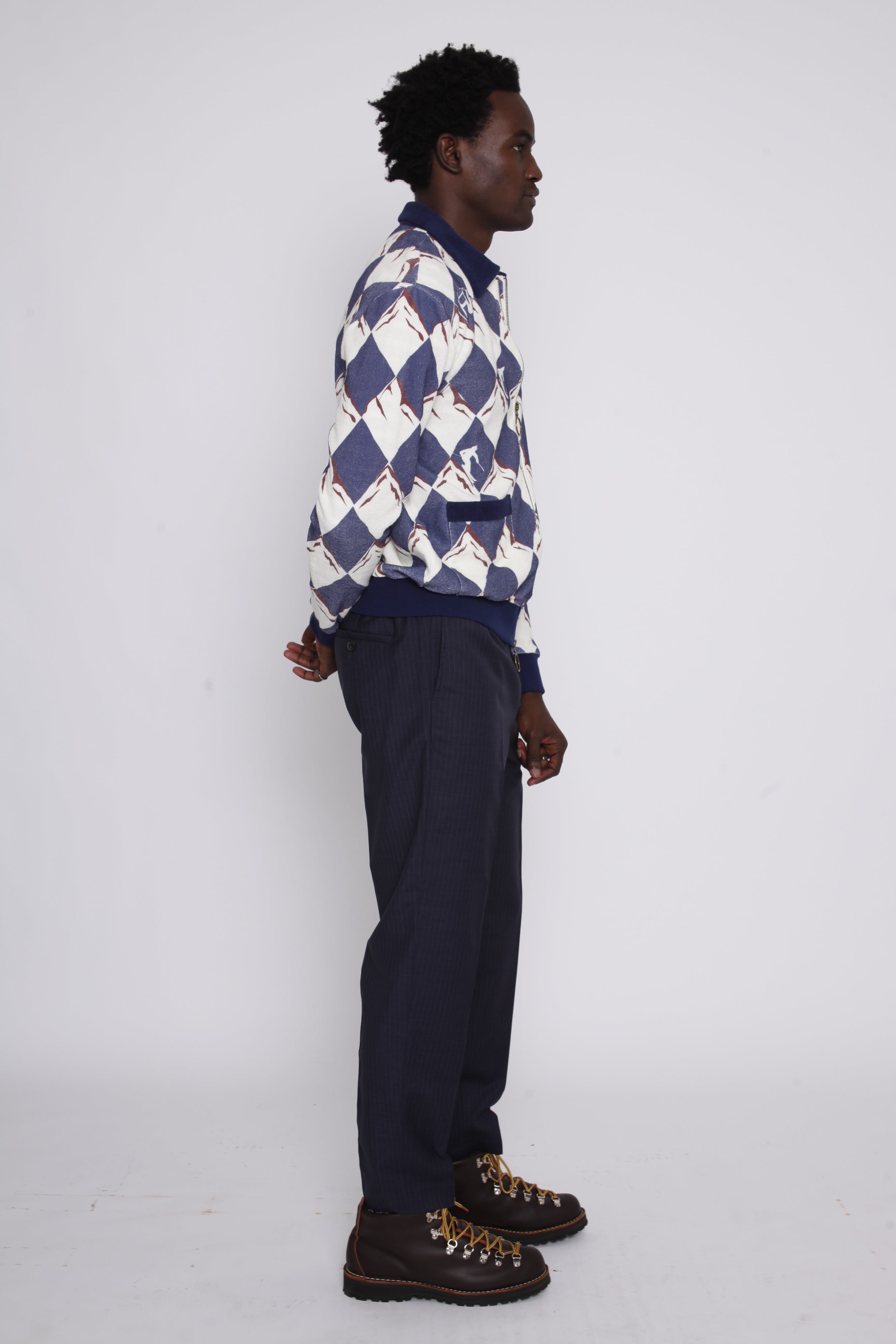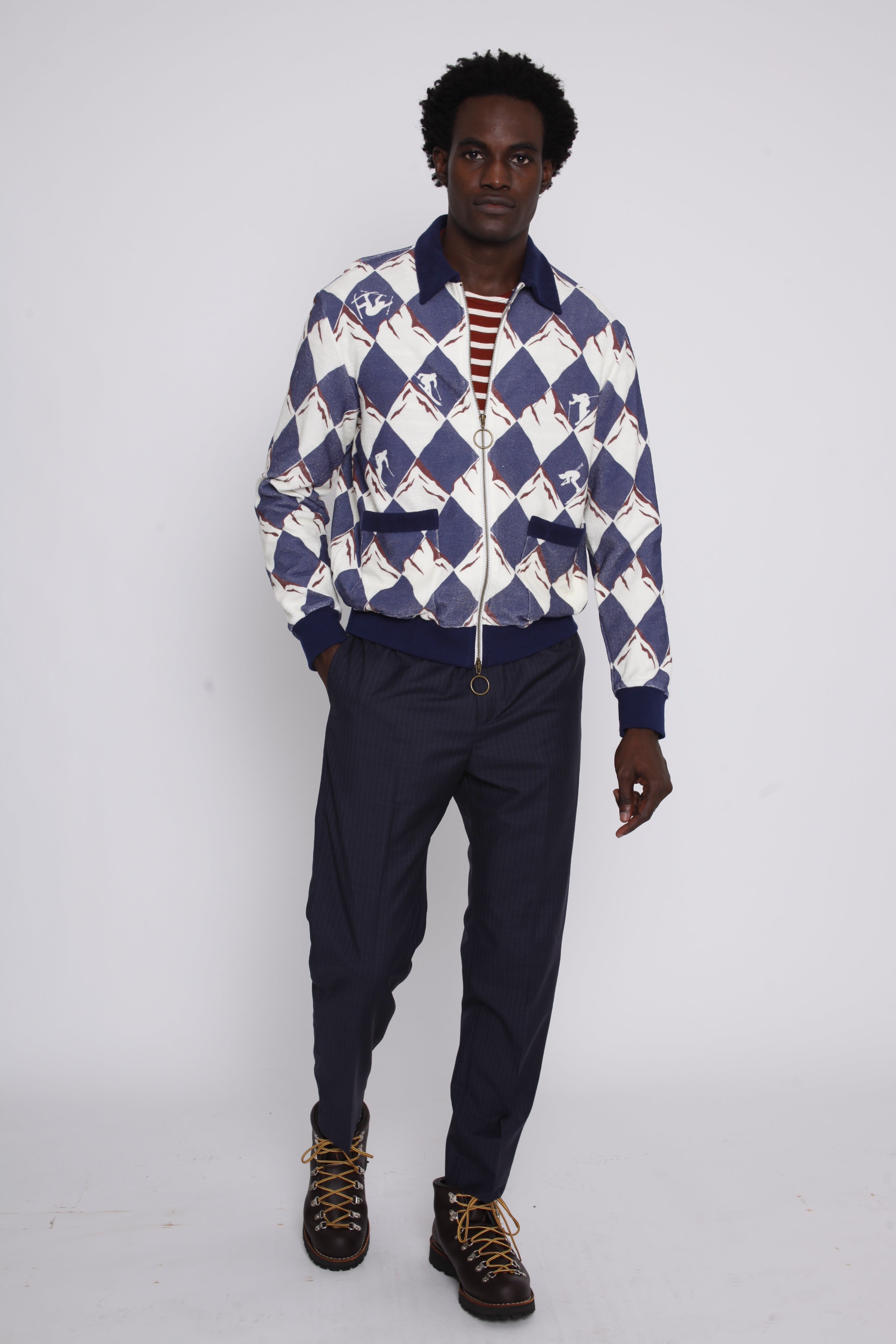 Digitally printed blue, white and red long-sleeve rendition of the classic cabana shirt reminiscent of skiing in the Alps.