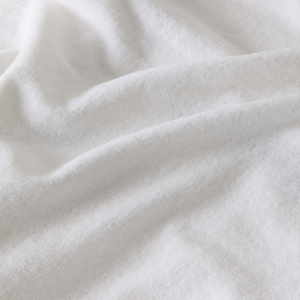Red and white organic cotton terrycloth. Embroidered palm tree and hibiscus flower. White rubber buttons.