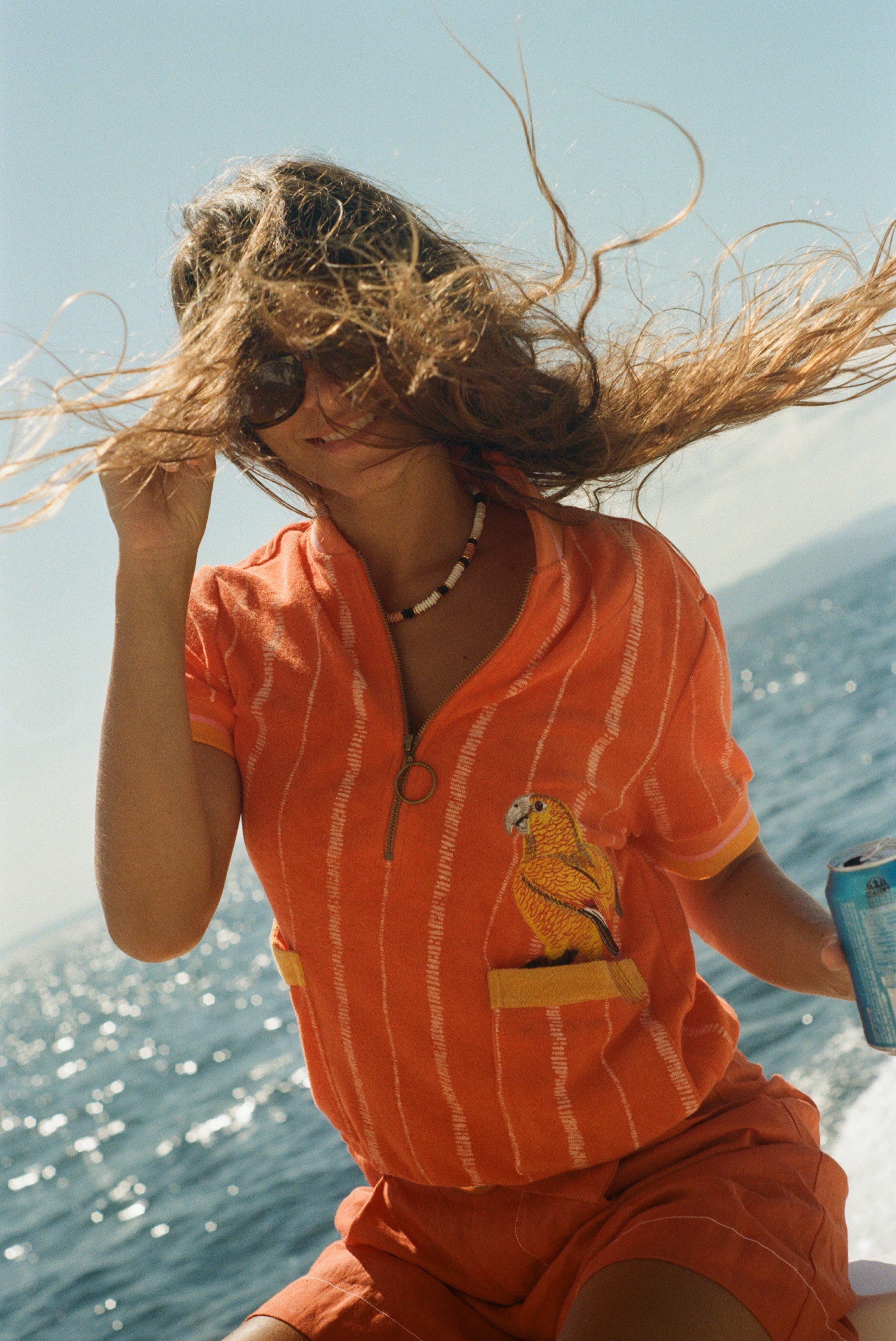 🦜 Made of 100% lightweight organic cotton terry cloth, this shirt doubles as a towel on a beach day. 🦜