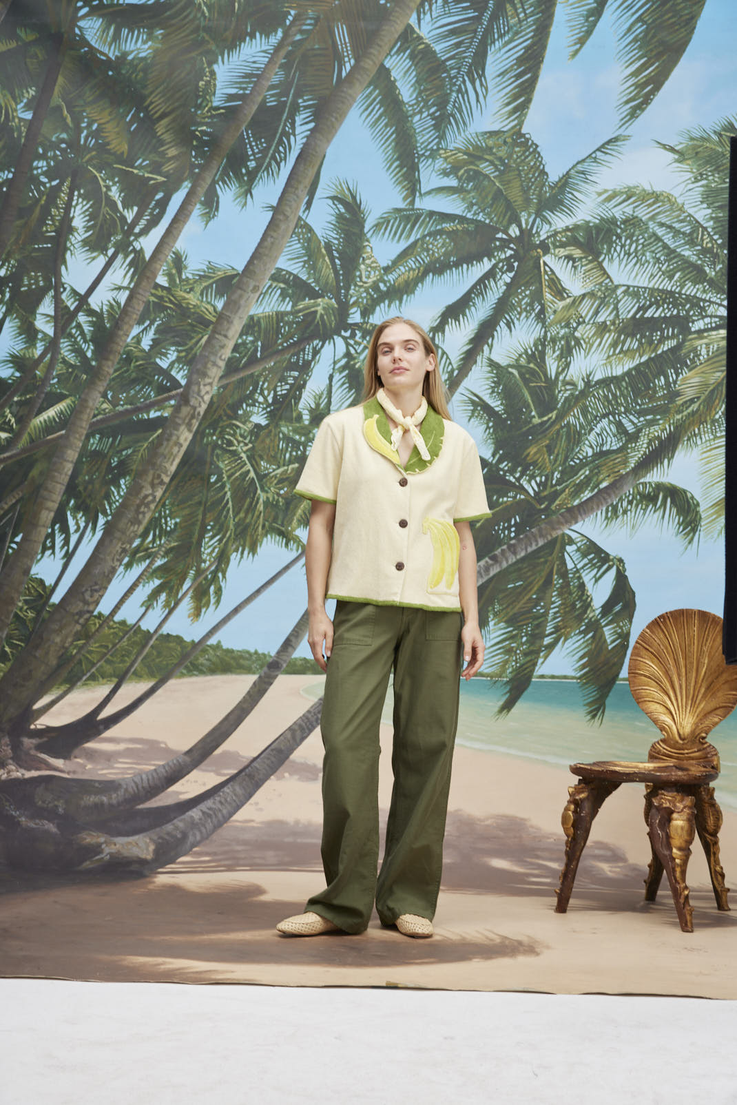 A playful banana bunch, appliquéd and edge-embroidered, decorates the wearer’s left patch pocket, secured with a discreet hidden button.