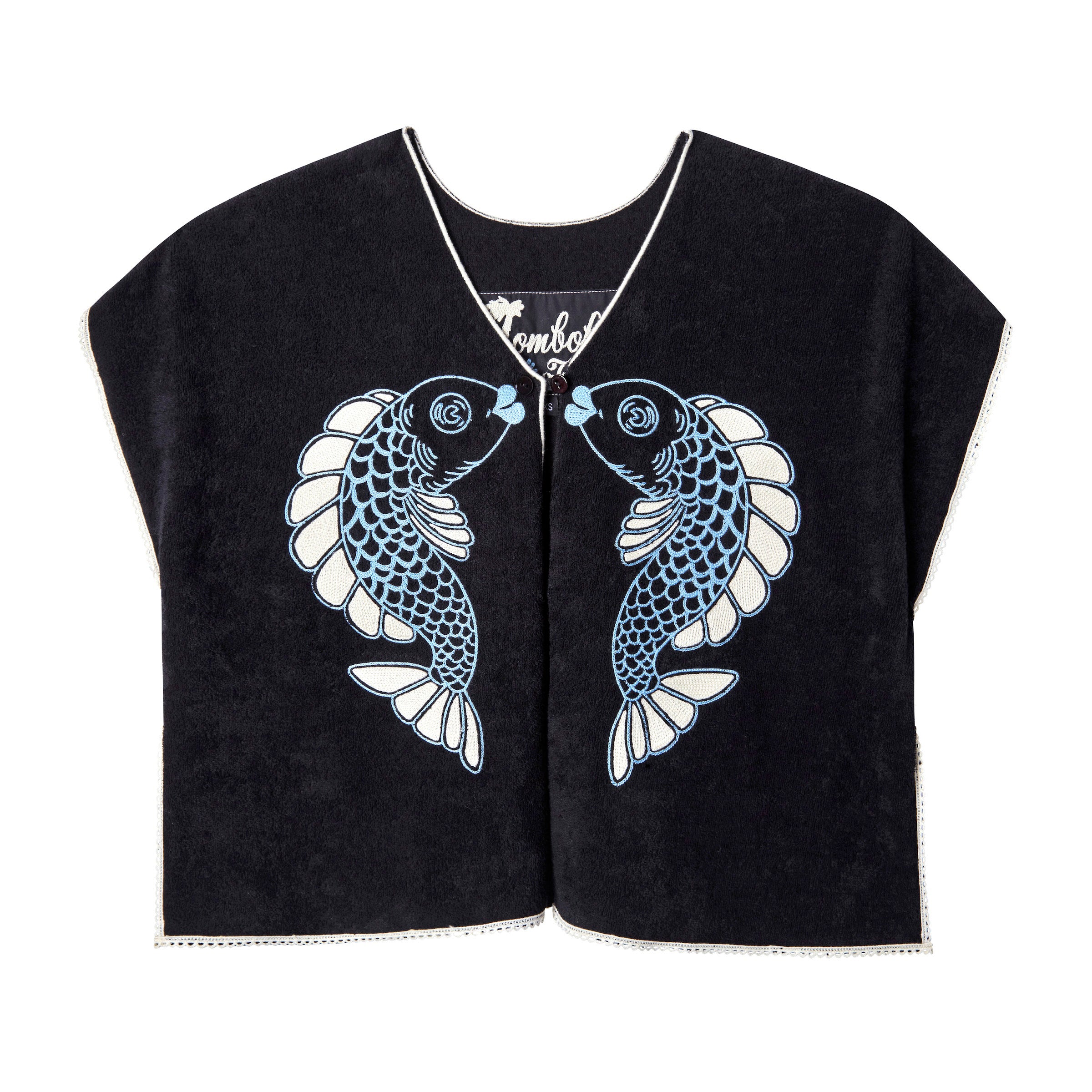 Cut from plush 350gsm double-faced organic cotton terry cloth, and chain-stitched with two amorous fish about to lock lips.