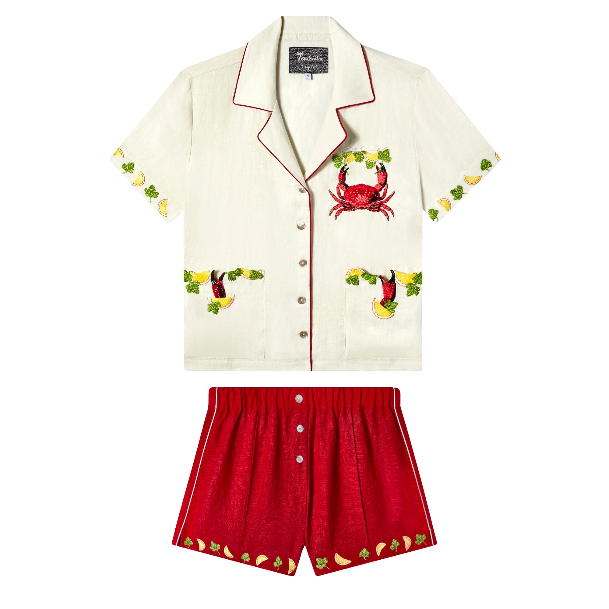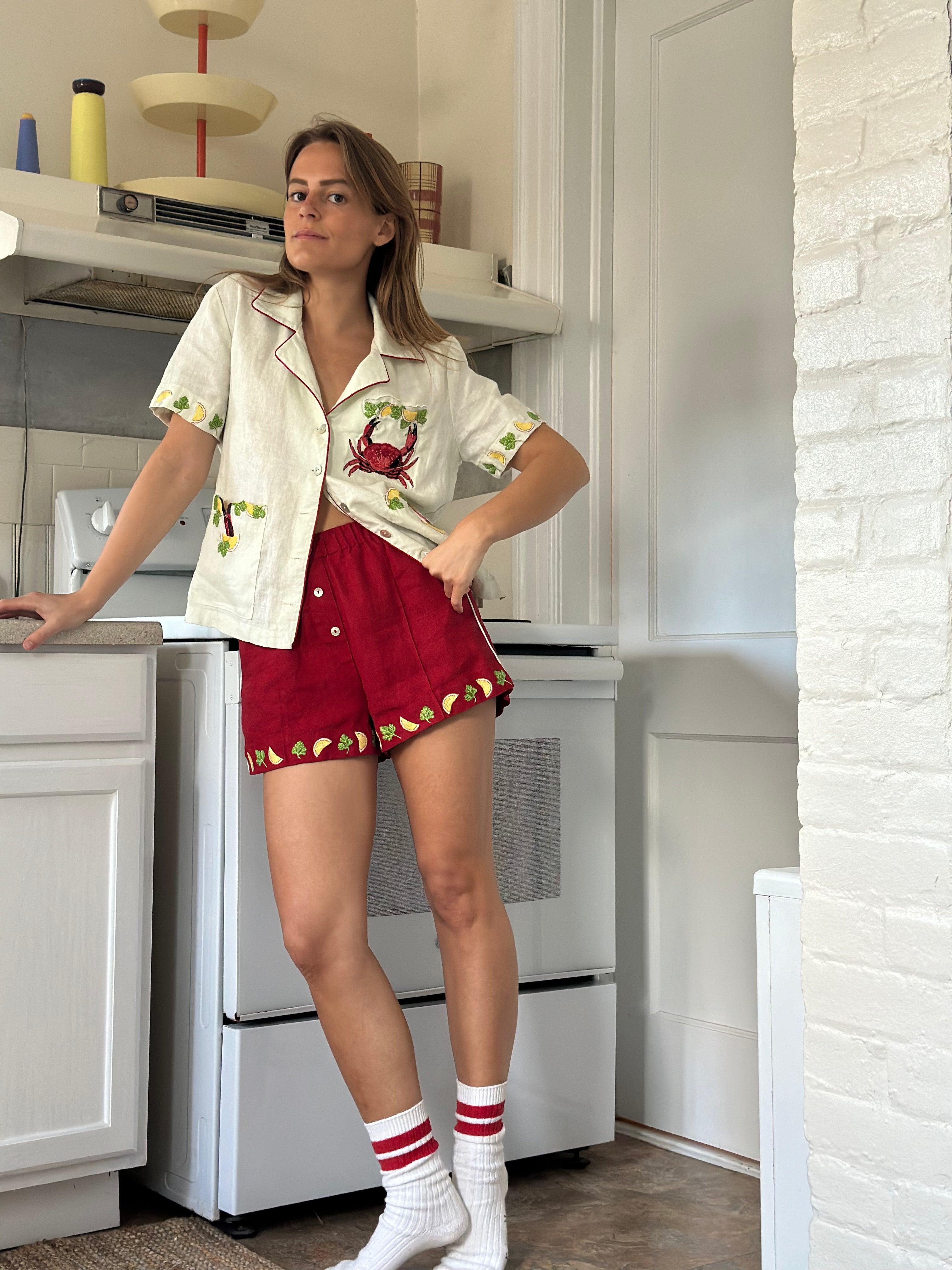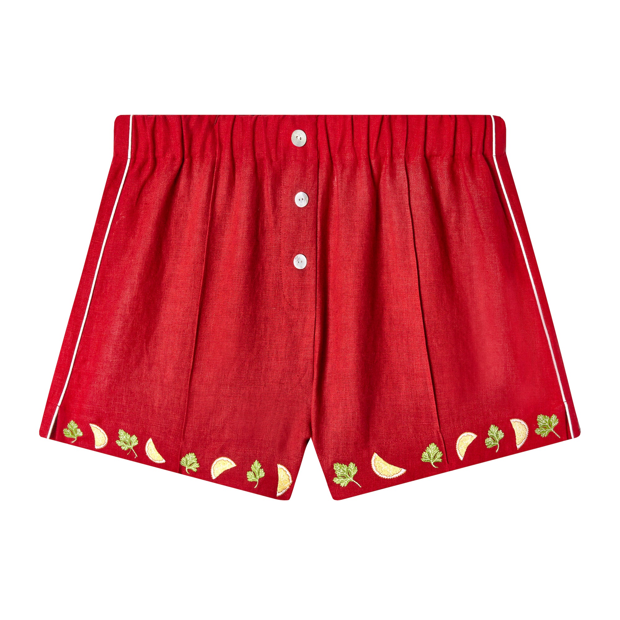Embroidered parsley and lemons along leg openings.
