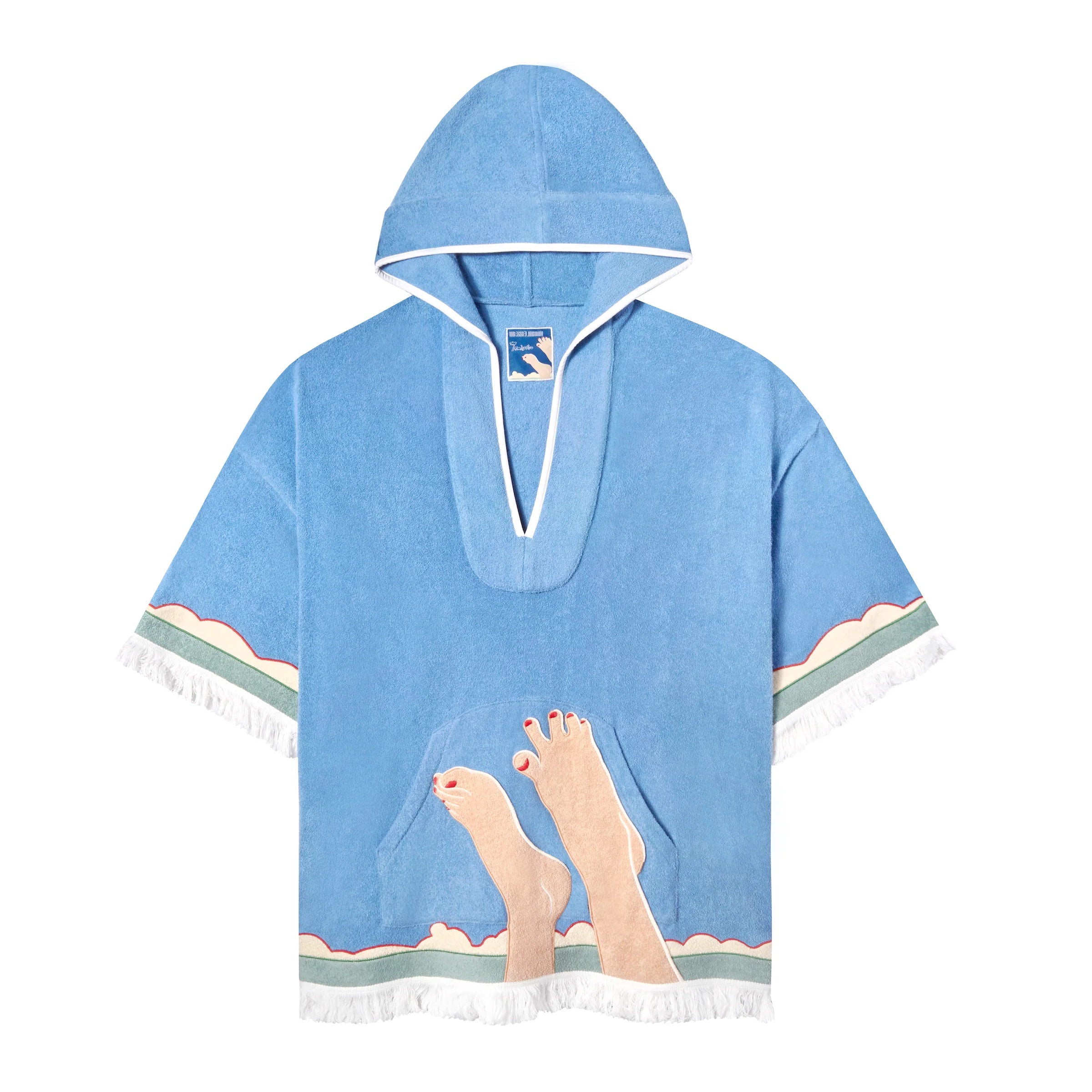 Appliquéd and edge-embroidered feet against sea, clouds and sky.