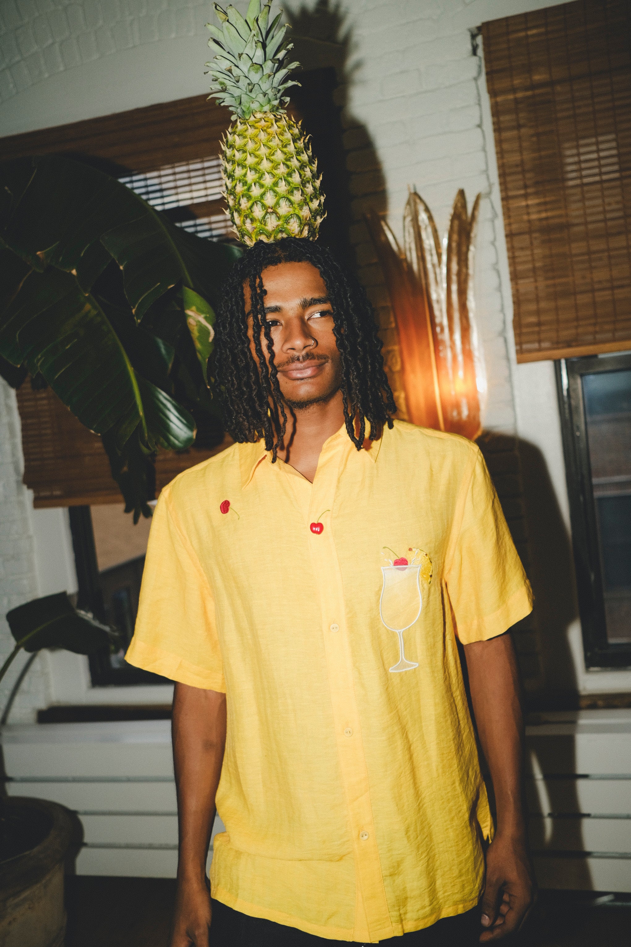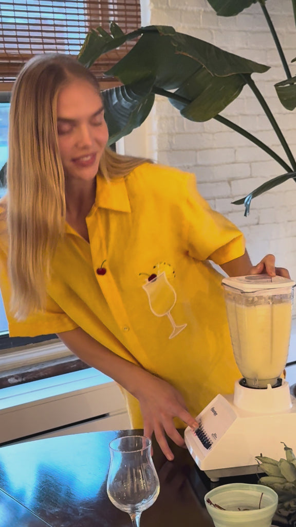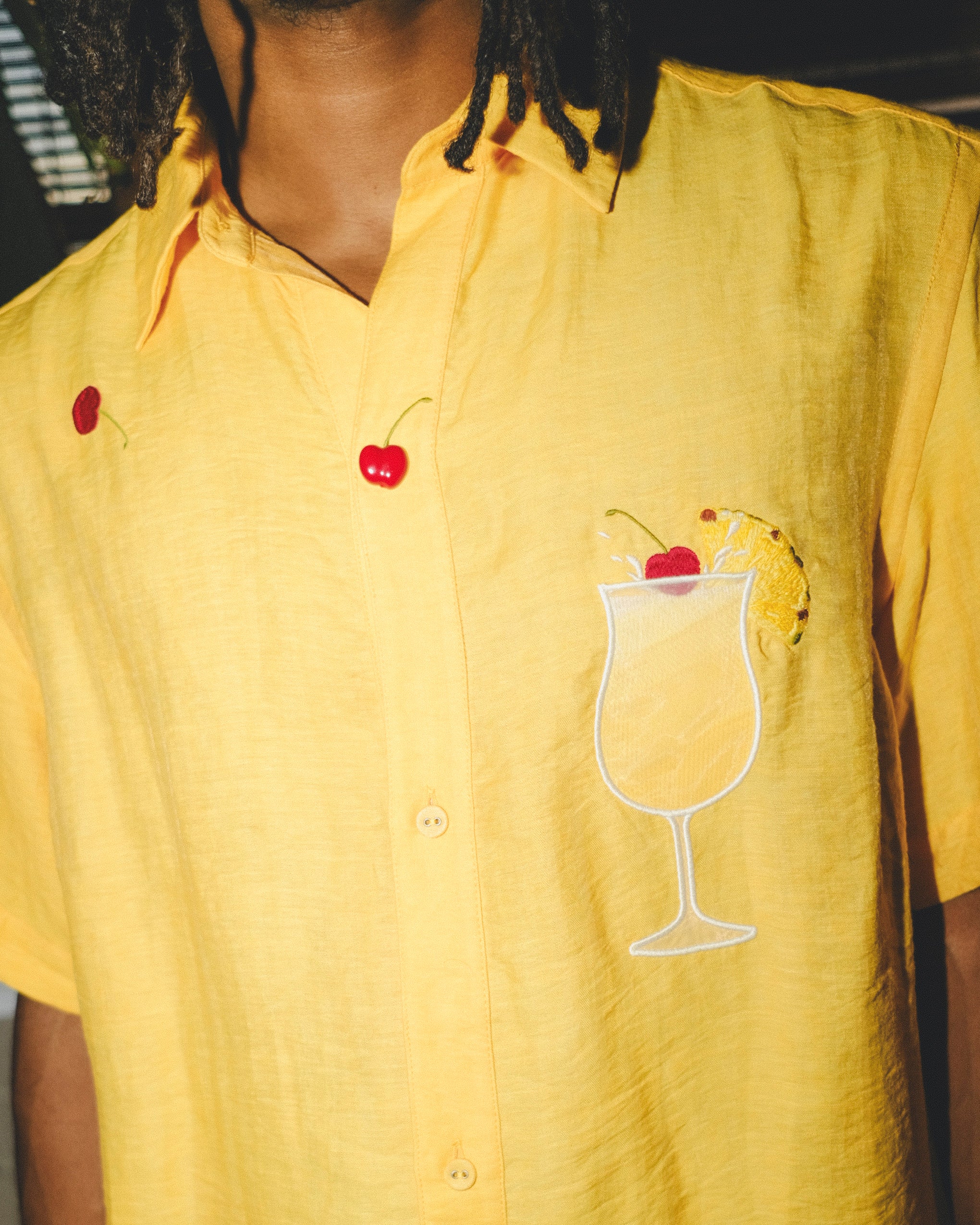 This piña colada shirt is our new relaxed fit: still a unisex camp collar style, but in a more generous, breezy cut than our standard fit. It is roomier through the body, with longer sleeves, and slightly dropped shoulders.