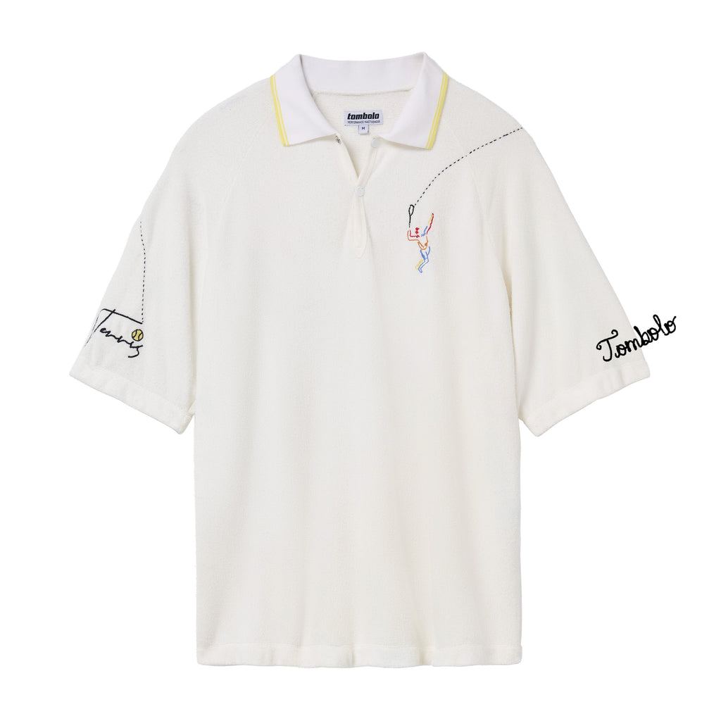Chainstitched tennis player and tennis logo, connected by a dotted ball path line that passes seamlessly from the shoulder, across the back and onto the wearer's right sleeve.
