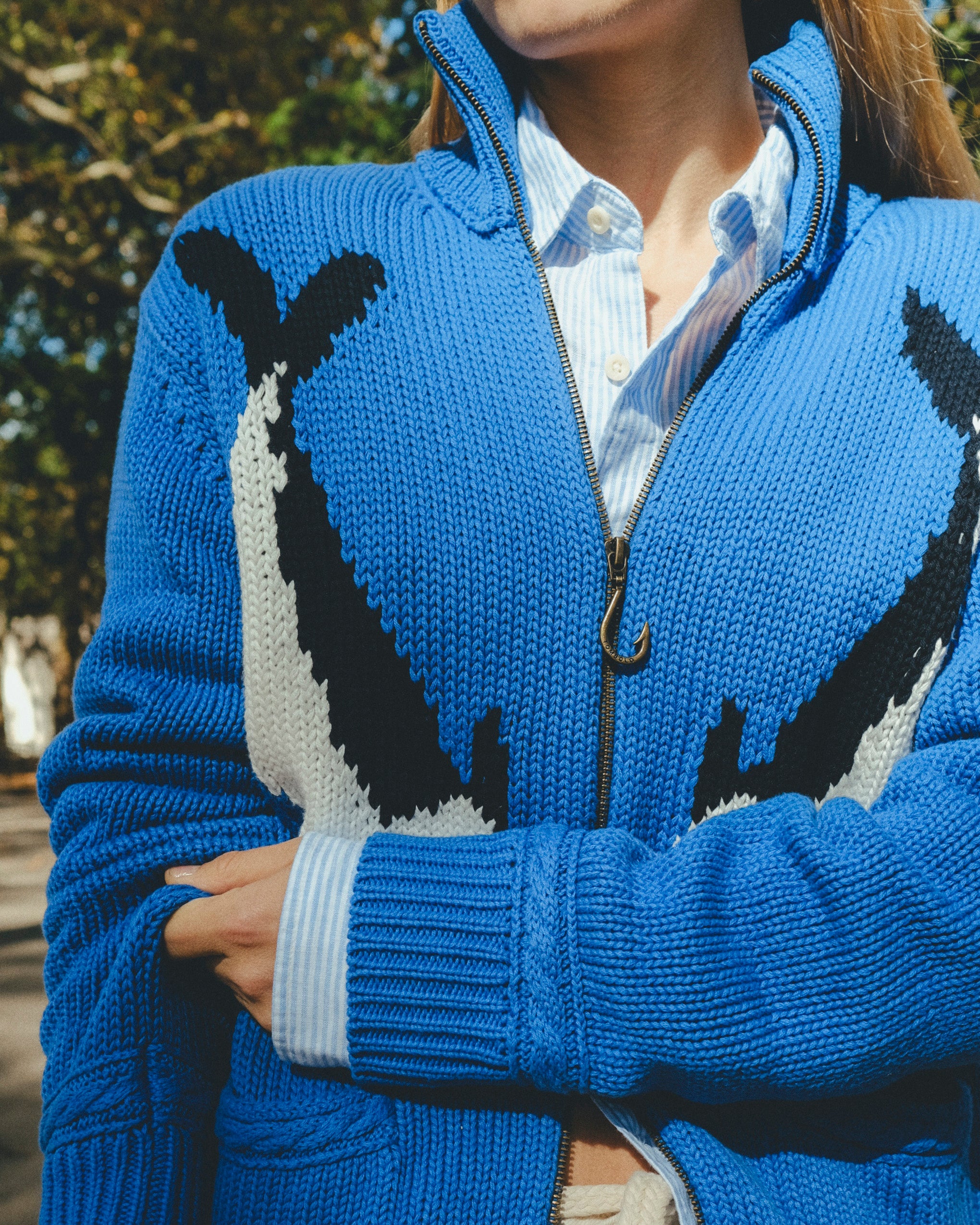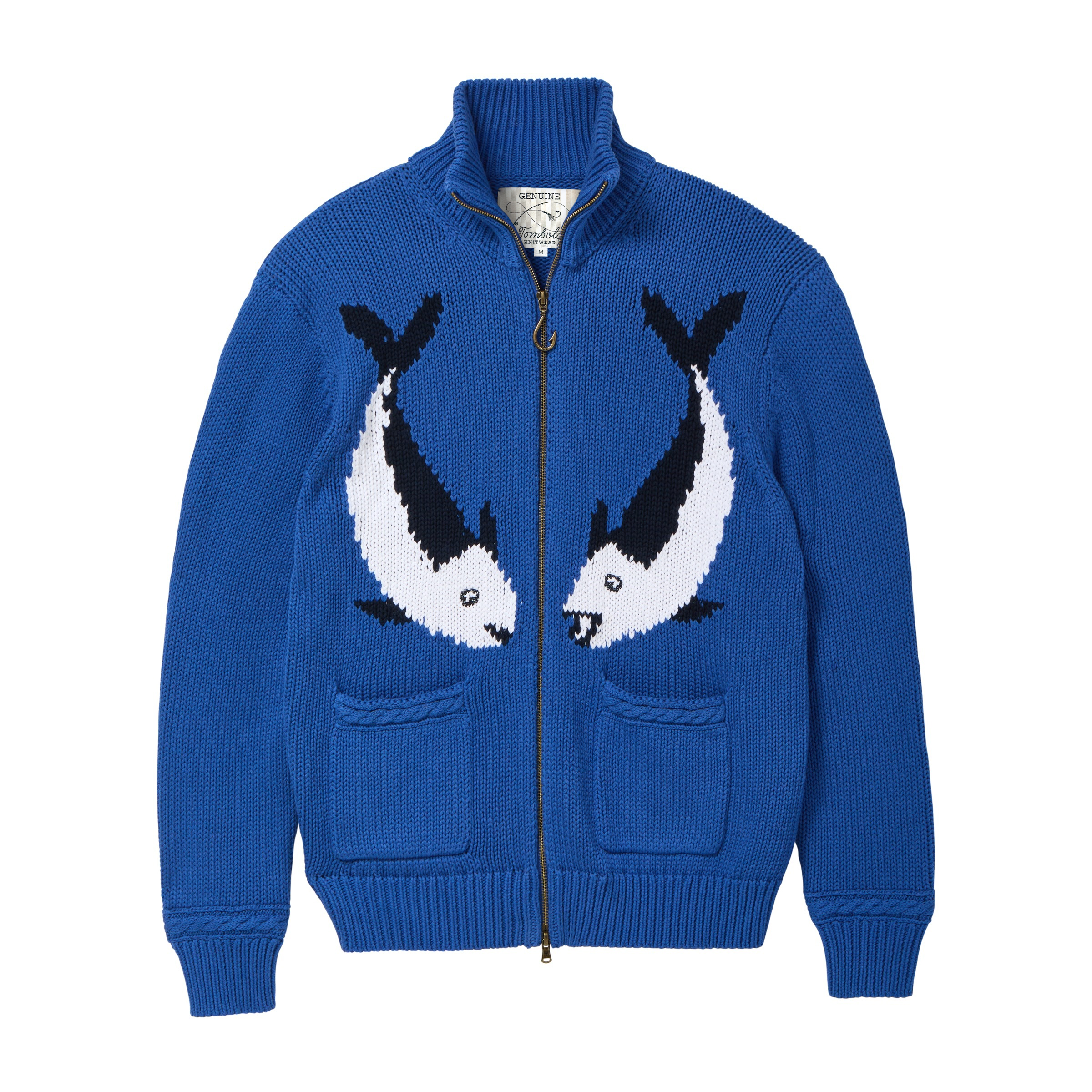 Intarsia knit fish graphic mirrored across the front.