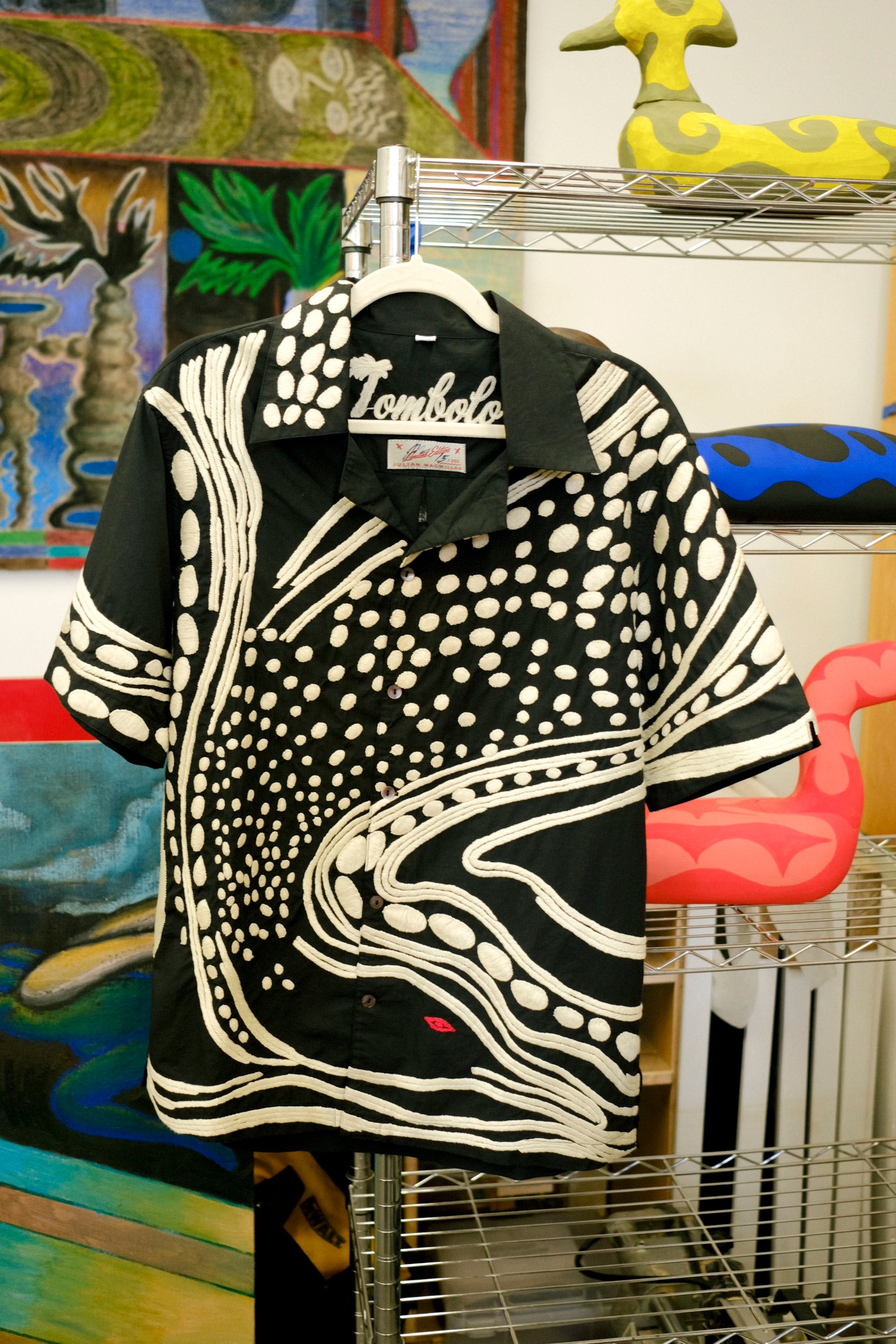 Julian’s bold and mesmerizing loons swim through mythology, dive into the subconscious, and surface in themes of rebirth. We are delighted to see one of Julian's iconic loons submerge itself in an entirely new medium - the fabric of this limited edition shirt.