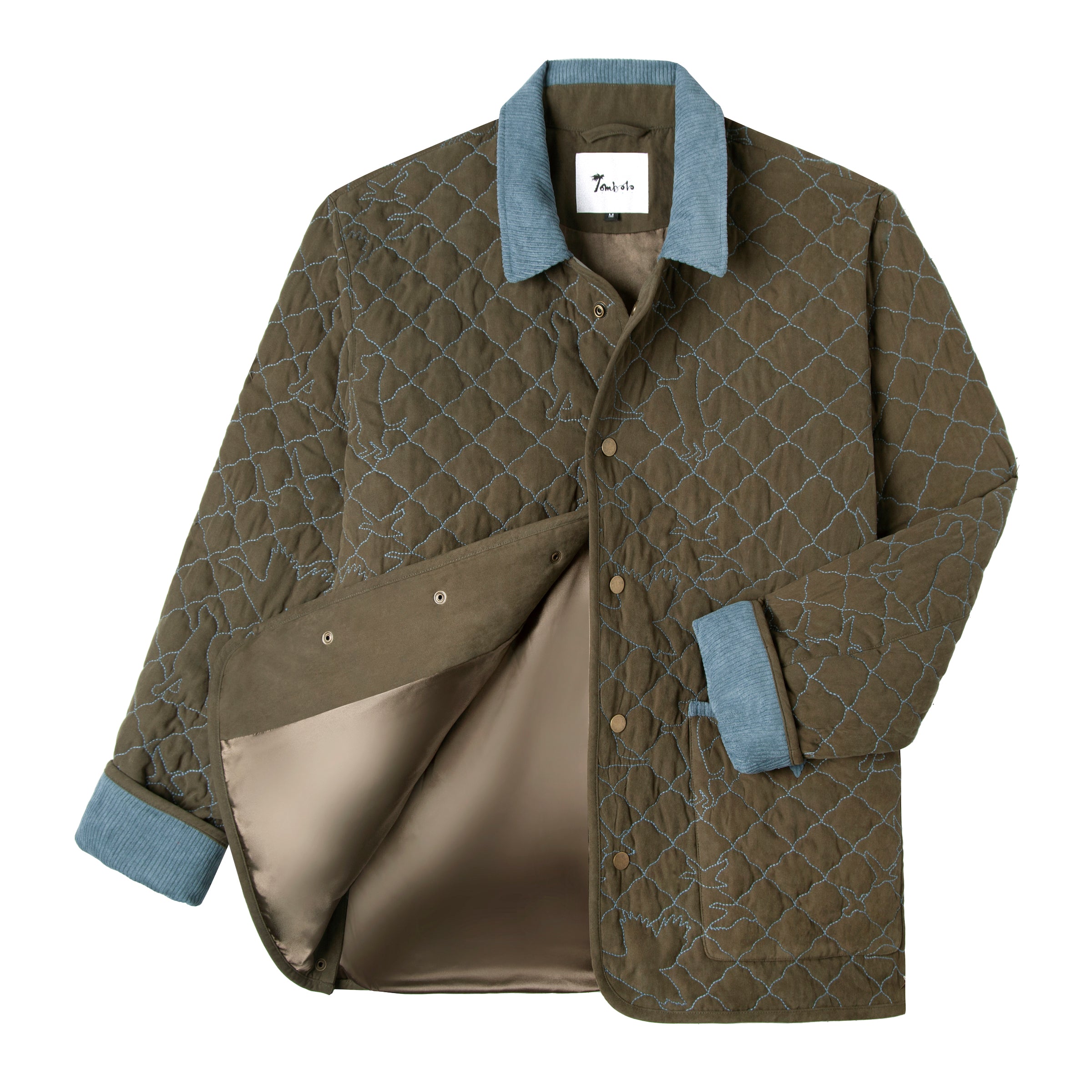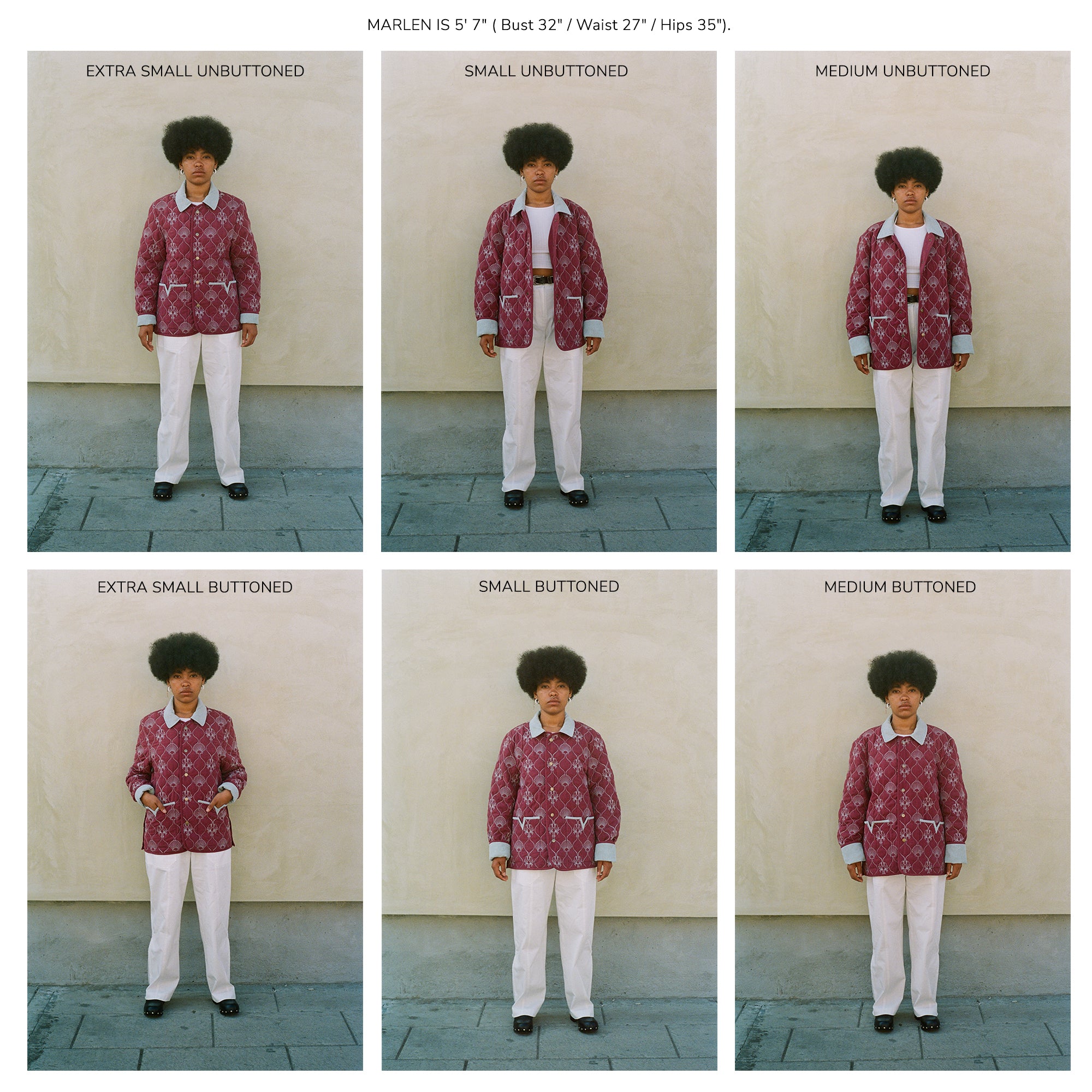 Marlén is 5' 7" with 32" bust / 27" waist / 35" hips. She is pictured wearing a size M jacket.