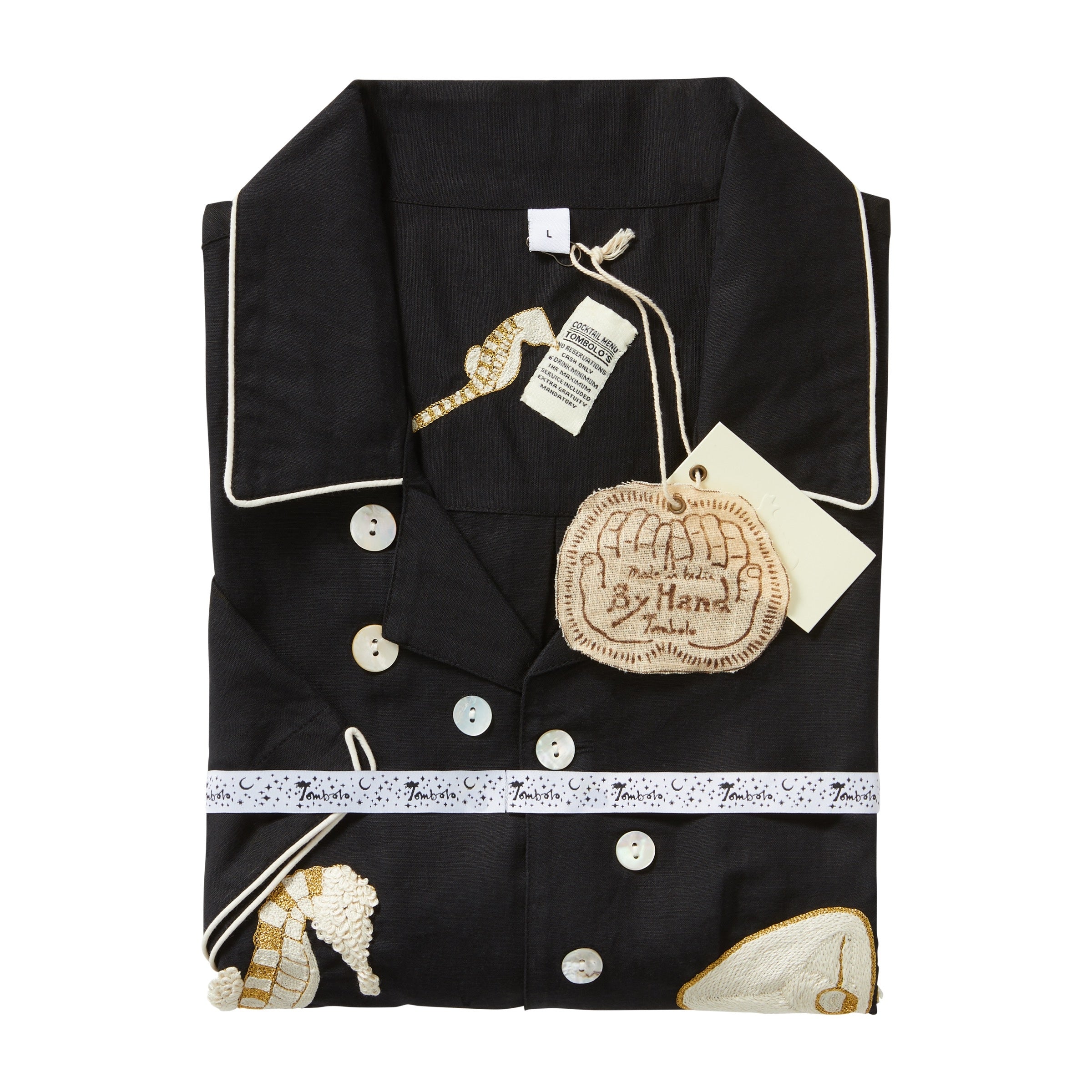 Hand-embroidered beige and 'old gold' seahorse bartenders work together to prepare the world's briniest martini. These dutiful mixologists are hand-embroidered with several different techniques, including french knotting.